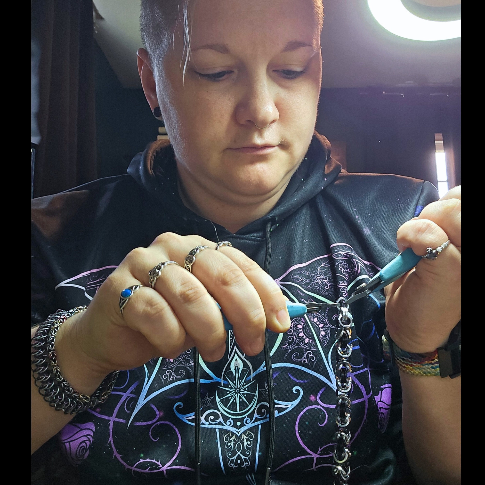 The types and styles of jewelry that can be made with chainmail and scales is endless. From dainty bracelets to lockable collars, elegant earrings to straps for glasses, there is not much that cannot be made with chainmail. There are numerous examples of what I can make both on my social media sites, as well as on the gallery page.